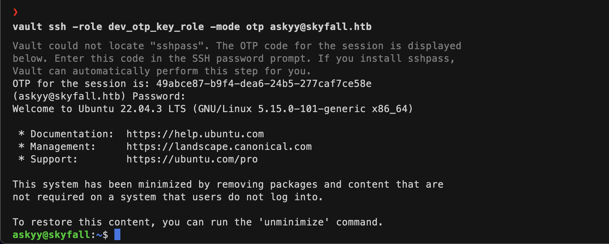 Now looking at the output, I can see that out of the two ways of ssh, it uses the OTP method. The help-two shows two flags to be passed, -role and -mode. I have values for both. The -mode is otp, now out of the two values I have of -role, only the dev_otp_key_role worked and got the user askyy shell. 😁😁